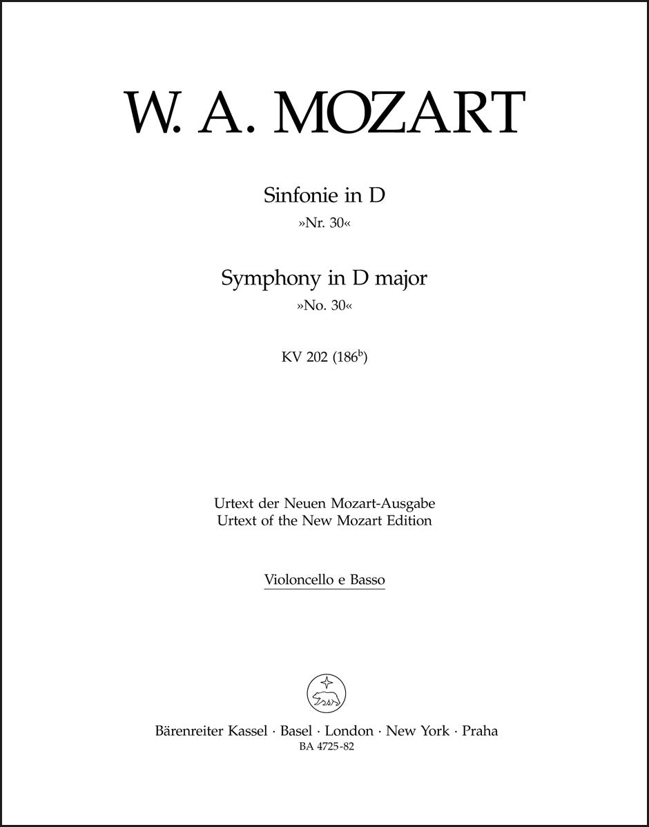 **Title**: Symphony no. 30 in D major K. 202 (186b) | **Composer / Author**: Mozart, Wolfgang Amadeus | **Editor**: Beck, Hermann | **Edition Type**: Part, Urtext edition | **Scoring/ Instrumentation**: Violoncello, Double bass | **Binding**: Stapled | **Weight**: 33.0 g | **Format**: 32,5 x 25,5 cm | **Pages**: 7 S. | **Language**: EN | Sample: https://data.baerenreiter.com/NB/BA/BA04725_82_9790006454310_nb_lrg_01.jpg