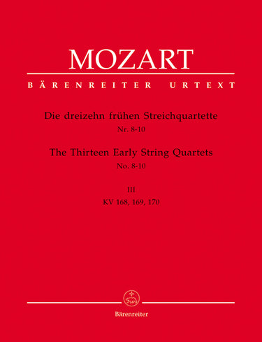 **Title**: The Thirteen Early String Quartets, Volume III K. 168, 169, 170 | **Composer / Author**: Mozart, Wolfgang Amadeus | **Editor**: Füssl, Karl Heinz / Plath, Wolfgang / Rehm, Wolfgang | **Edition Type**: Set of parts, Urtext edition, Anthology | **Instrumentation**: String quartet | **Scoring/ Instrumentation**: Violins (2), Viola, Violoncello | **Binding**: Stapled | **Level of Difficulty**: 4.0 | **Printing**: 13th printing 2018 | **Weight**: 284.0 g | **Format**: 31,0 x 24,3 cm | **Pages**: 16/15/15/13 S. | **Language**: EN | Sample: https://data.baerenreiter.com/NB/BA/BA04849_00_9790006456963_nb_lrg_01.jpg