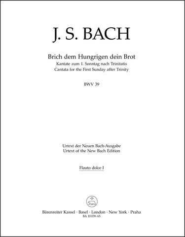 **Title**: Break with hungry men thy bread BWV 39 | **Subtitle**: Cantata for the first sunday after Trinity | **Composer / Author**: Bach, Johann Sebastian | **Editor**: Dürr, Walther / Freeman, Robert / Webster, James | **Edition Type**: Wind set, Urtext edition | **Scoring/ Instrumentation**: 1. Recorder, 2. Recorder, 1. Oboe, 2. Oboe | **Binding**: Stapled | **Weight**: 125.0 g | **Format**: 32,5 x 25,5 cm | **Pages**: 5/5/5/4 S. | **Language**: EN | Sample: https://data.baerenreiter.com/NB/BA/BA10039_65_9790006541386_nb_lrg_01.jpg