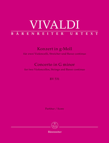 **Title**: Concerto for two Violoncellos, Strings and Basso continuo in G minor RV 531 | **Composer / Author**: Vivaldi, Antonio | **Editor**: Schwemer, Bettina | **Edition Type**: Score, Urtext edition | **Scoring/ Instrumentation**: Violoncellos (2), Violins (2), Viola, Basso | **Binding**: Stapled | **Printing**: 1st printing 2021 | **Weight**: 149.0 g | **Format**: 31,0 x 24,3 cm | **Pages**: VIII, 17 S. | **Language**: EN | Sample: https://data.baerenreiter.com/NB/BA/BA10946_00_9790006569748_nb_lrg_01.jpg