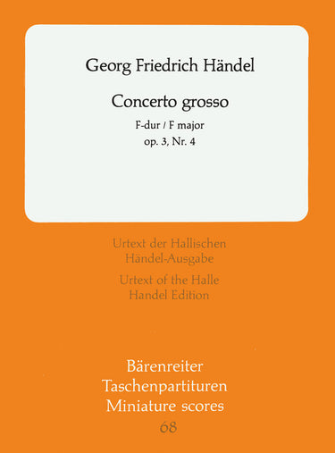 **Title**: Concerto grosso F-Dur op. 3/4 HWV 315 | **Composer / Author**: Handel, George Frideric | **Editor**: Hudson, Frederick | **Edition Type**: Study score, Urtext edition | **Instrumentation**: Orchestra | **Binding**: Stapled | **Weight**: 32.0 g | **Format**: 18,5 x 13,5 cm | **Pages**: 12 S. | **Language**: EN | Sample: https://data.baerenreiter.com/NB/TP/TP00068_00_9790006200566_nb_lrg_01.jpg