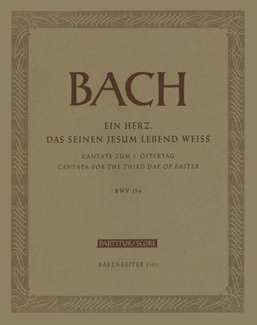 **Title**: Ein Herz, das seinen Jesum lebend weiß BWV 134 | **Subtitle**: Cantata for Easter Tuesday | **Misc Information**: third version | **Composer / Author**: Bach, Johann Sebastian | **Editor**: Dürr, Alfred | **Edition Type**: Score, Urtext edition | **Scoring/ Instrumentation**: Vocal, Mixed choir (SATB), Orchestra | **Binding**: Stapled | **Level of Difficulty**: 3.0 | **Weight**: 233.0 g | **Format**: 32,4 x 25,5 cm | **Pages**: 37 S. | **Language**: EN | Sample: https://data.baerenreiter.com/NB/BA/BA10134_00_9790006491087_nb_lrg_01.jpg