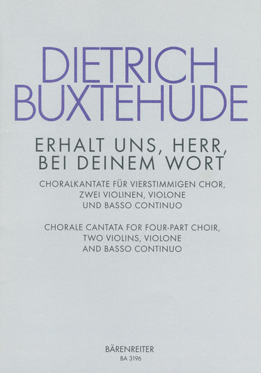 **Title**: Erhalt uns Herr, bei deinem Wort - Uphold us by Thy mighty BuxWV 27 | **Subtitle**: Choralkantate | **Composer / Author**: Buxtehude, Dietrich | **Editor**: Grusnick, Bruno | **Edition Type**: Score, Set of parts | **Instrumentation**: Choir, Strings, Basso continuo | **Scoring/ Instrumentation**: Mixed choir (SATB), Strings, Basso continuo | **Binding**: Stapled | **Level of Difficulty**: 3.0 | **Printing**: 12. Aufl. 2019 | **Language of Text Part**: German | **Weight**: 71.0 g | **Format**: 27,0 x 19,0 cm | **Pages**: 16/2/2/2/3 S. | **Language**: EN | Sample: https://data.baerenreiter.com/NB/BA/BA03196_00_9790006431205_nb_lrg_01.jpg