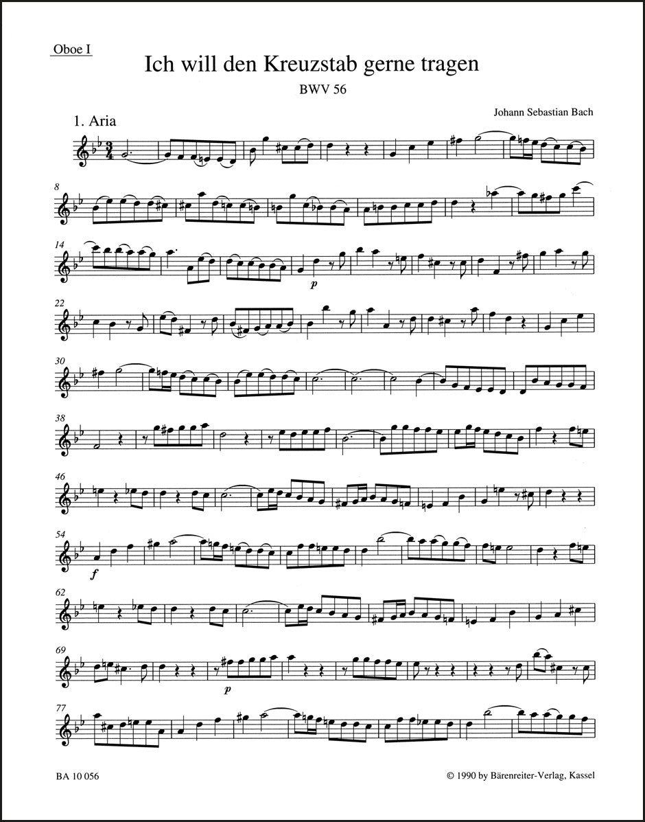 **Title**: I will my cross-staff gladly carry BWV 56 "Cross Staff Cantata (Kreuzstabkantate)" | **Subtitle**: Cantata for the 19th Sunday after Trinity | **Comments on Version**: Study score = TP 1056 | **Composer / Author**: Bach, Johann Sebastian | **Editor**: Wendt, Matthias | **Edition Type**: Wind set, Urtext edition | **Scoring/ Instrumentation**: Oboe, Cor anglais | **Binding**: Stapled | **Duration**: 00:21:00 | **Weight**: 41.0 g | **Format**: 32,5 x 25,5 cm | **Pages**: 5/3/2 S. | **Language**: EN | Sample: https://data.baerenreiter.com/NB/BA/BA10056_65_9790006503315_nb_lrg_01.jpg