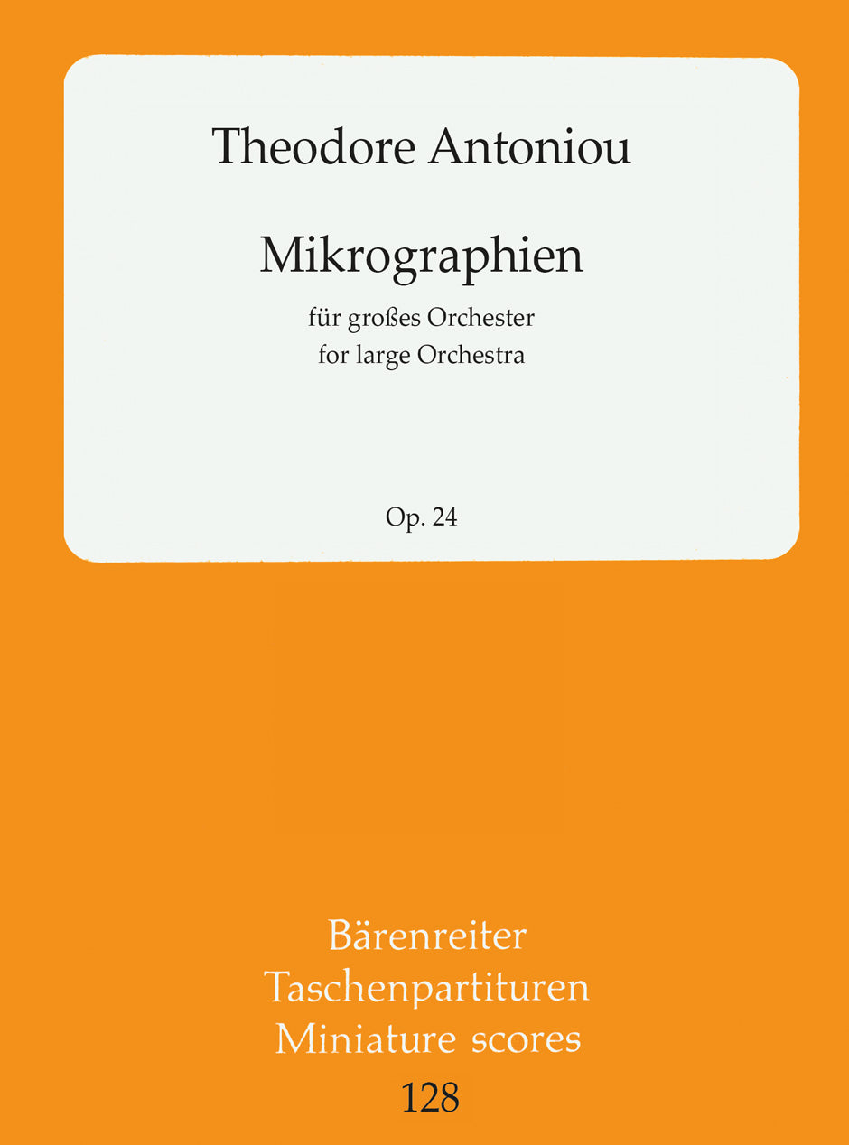 **Title**: Mikrographien für Orchester op. 24 (1964) | **Composer / Author**: Antoniou, Theodore | **Edition Type**: Study score | **Instrumentation**: Orchestra | **Binding**: Stapled | **Duration**: 00:15:00 | **Weight**: 112.0 g | **Format**: 22,5 x 16,0 cm | **Pages**: 59 S. | **Language**: EN | Sample: https://data.baerenreiter.com/NB/TP/TP00128_00_9790006201068_nb_lrg_01.jpg