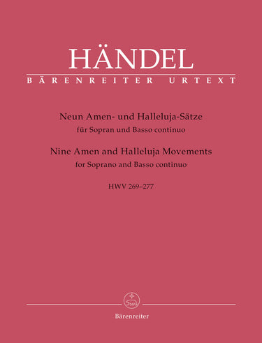 **Title**: Nine Amen and Halleluja Movements for Soprano and Basso continuo HWV 269-277 | **Comments on Version**: Continuo realization by Christoph Harer | **Composer / Author**: Handel, George Frideric | **Editor**: Blaut, Stephan | **Preface**: Blaut, Stephan | **Edition Type**: Singing Score, Urtext edition, Anthology | **Scoring/ Instrumentation**: Soprano solo, Basso continuo | **Binding**: Stapled | **Printing**: 1st printing 2012 | **Language of Text Part**: Latin | **Weight**: 150.0 g | **Format**: 30,0 x 23,0 cm | **Pages**: VI, 26 S. | **Language**: EN | Sample: https://data.baerenreiter.com/NB/BA/BA10256_00_9790006536535_nb_lrg_01.jpg