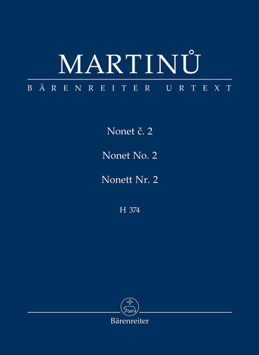 **Title**: Nonet no. 2 H 374 | **Comments**: Replaces H 3022 | **Comments on Version**: Unlike the version in the complete edition, the clarinet part has been transposed for the clarinet in B-flat | **Composer / Author**: Martinu, Bohuslav | **Editor**: Zichová, Jitka | **Preface**: Zichová, Jitka | **Edition Type**: Study score, Urtext edition | **Binding**: Stapled | **Level of Difficulty**: 4.0 | **Duration**: 00:17:00 | **Printing**: 1st printing 2017 | **Weight**: 149.0 g | **Format**: 22,5 x 16,5 cm | **Pages**: XI, 53 S. | **Language**: EN | Sample: https://data.baerenreiter.com/NB/TP/TP00440_00_9790260108455_nb_lrg_01.jpg