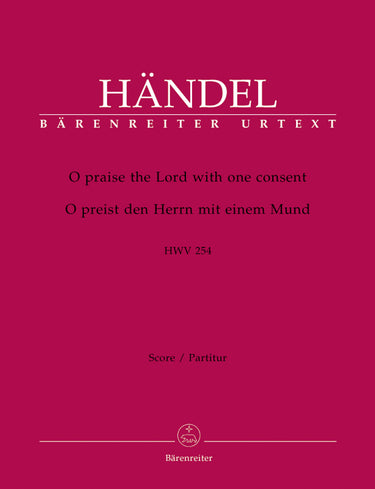 **Title**: O praise the Lord with one consent HWV 254 | **Composer / Author**: Handel, George Frideric | **Editor**: Hendrie, Gerald | **Preface**: Hendrie, Gerald | **Edition Type**: Score, Urtext edition | **Scoring/ Instrumentation**: Vocal, Mixed choir, Orchestra | **Binding**: Stapled | **Level of Difficulty**: 3.0 | **Printing**: 1st printing 2006 | **Weight**: 295.0 g | **Format**: 31,0 x 24,2 cm | **Pages**: VI, 70 S. | **Language**: EN | Sample: https://data.baerenreiter.com/NB/BA/BA04291_00_9790006532377_nb_lrg_01.jpg