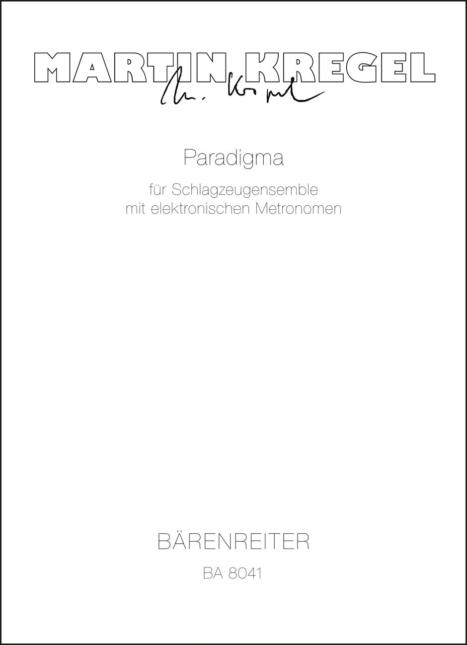 **Title**: Paradigma | **Subtitle**: Schlagzeugensemble (5 Spieler) und elektronische Metronome | **Composer / Author**: Kregel, Martin | **Edition Type**: Performance score | **Instrumentation**: Drums | **Scoring/ Instrumentation**: Drums | **Binding**: in a folder | **Level of Difficulty**: 3.0 | **Weight**: 65.0 g | **Format**: 29,1 x 21,1 cm | **Pages**: 9 S. | **Language**: EN | Sample: https://data.baerenreiter.com/NB/BA/BA08041_00_9790006488162_nb_lrg_01.jpg