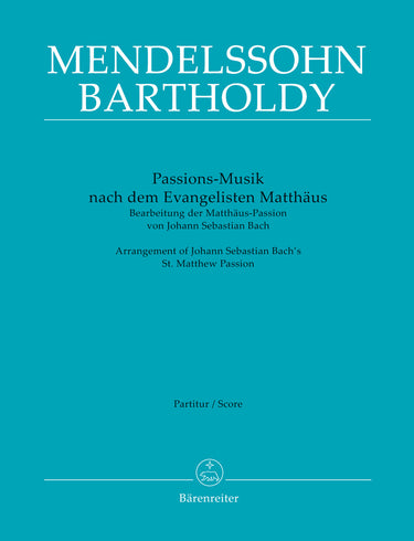 **Title**: Passion Music after the Evangelist Matthew | **Subtitle**: Arrangement of Johann Sebastian Bach's St. Matthew Passion | **Composer / Author**: Bach, Johann Sebastian | **Arranger**: Mendelssohn Bartholdy, Felix | **Editor**: Bruno, Malcolm / Ritchie, Caroline | **Preface**: Bruno, Malcolm / Ritchie, Caroline | **Edition Type**: Score | **Instrumentation**: Soloists, Mixed choir, Orchestra | **Binding**: Paperback | **Duration**: 02:00:00 | **Printing**: 1st printing 2023 | **Language of Text Part**: German | **Weight**: 1110.0 g | **Format**: 31,0 x 24,3 cm | **Pages**: XXIV, 260 S. | **Language**: EN | Sample: https://data.baerenreiter.com/NB/BA/BA11308_00_9790006567683_nb_lrg_01.jpg