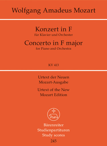 **Title**: Piano Concerto in F major K. 413(387a) | **Subtitle**: Concerto for piano and orchestra | **Composer / Author**: Mozart, Wolfgang Amadeus | **Editor**: Wolff, Christoph | **Edition Type**: Study score, Urtext edition | **Instrumentation**: Piano, Orchestra | **Binding**: Stapled | **Weight**: 121.0 g | **Format**: 22,5 x 16,5 cm | **Pages**: 60 S. | **Language**: EN | Sample: https://data.baerenreiter.com/NB/TP/TP00245_00_9790006202133_nb_lrg_01.jpg