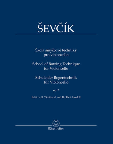 **Title**: School of Bowing Technique for Violoncello op. 2 | **Misc Information**: Sections I and II | **Composer / Author**: Ševcík, Otakar | **Edition Type**: Performance score | **Instrumentation**: Violoncello | **Scoring/ Instrumentation**: Violoncello | **Binding**: Stapled | **Level of Difficulty**: 3.0 | **Printing**: 1st printing 2018 | **Weight**: 358.0 g | **Format**: 31,0 x 24,3 cm | **Pages**: XVI, 44/23 S. | **Language**: EN | Sample: https://data.baerenreiter.com/NB/BA/BA11547_00_9790260108479_nb_lrg_01.jpg