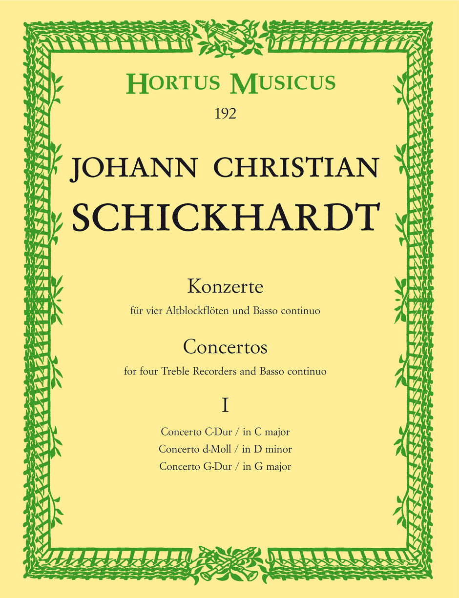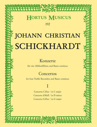**Title**: Sechs Konzerte für 4 Altblockflöten und Basso continuo | **Misc Information**: Heft 1 | **Composer / Author**: Schickhardt, Johann Christian | **Editor**: Knab, Richard, Valentin | **Edition Type**: Performance score, Set of parts | **Instrumentation**: Recorder, Basso continuo | **Scoring/ Instrumentation**: Treble recorders (4), Basso continuo | **Binding**: Stapled | **Level of Difficulty**: 3.0 | **Printing**: 13. Aufl. 2020 | **Weight**: 293.0 g | **Format**: 30,0 x 23,0 cm | **Pages**: 32/8/6/6/6/6 S. | **Language**: EN | Sample: https://data.baerenreiter.com/NB/HM/HM00192_00_9790006003792_nb_lrg_01.jpg