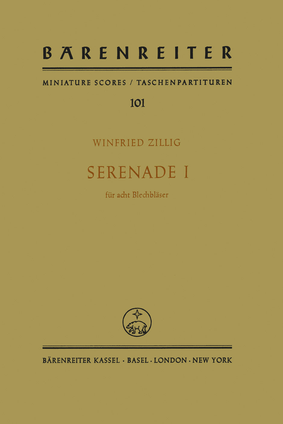 **Title**: Serenade I für acht Blechbläser (1927/1928) | **Composer / Author**: Zillig, Winfried | **Edition Type**: Study score | **Binding**: Stapled | **Weight**: 61.0 g | **Format**: 22,5 x 15,0 cm | **Pages**: 35 S. | **Language**: EN | Sample: https://data.baerenreiter.com/NB/TP/TP00101_00_9790006200818_nb_lrg_01.jpg