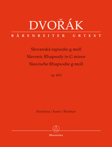 **Title**: Slavonic Rhapsody in G minor op. 45/2 | **Composer / Author**: Dvorak, Antonin | **Editor**: Simon, Robert | **Edition Type**: Score, Urtext edition | **Scoring/ Instrumentation**: Orchestra | **Binding**: Paperback | **Level of Difficulty**: 3.0 | **Printing**: 1st printing 2018 | **Weight**: 391.0 g | **Format**: 24,3 x 31,0 cm | **Pages**: IX, 79 S. | **Language**: EN | Sample: https://data.baerenreiter.com/NB/BA/BA10402_00_9790260104723_nb_lrg_01.jpg