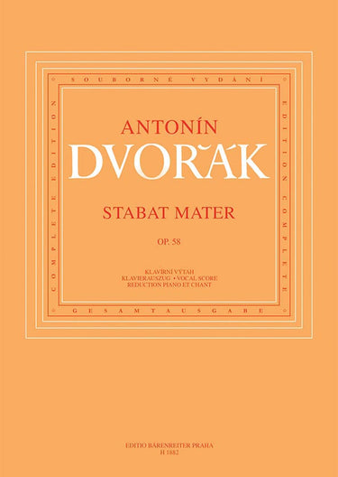 **Title**: Stabat Mater op. 58 | **Comments on Version**: The performance material both to the version for orchestra and to the seven-movement original piano version (Version 1876) is available on hire | **Composer / Author**: Dvorak, Antonin | **Edition Type**: Vocal Score | **Instrumentation**: Soloists, Choir, Orchestra | **Binding**: Paperback | **Language of Text Part**: Latin | **Weight**: 503.0 g | **Format**: 26,7 x 18,9 cm | **Pages**: 184 S. | **Language**: EN | Sample: https://data.baerenreiter.com/NB/H/H01882_00_9790260104877_nb_lrg_01.jpg