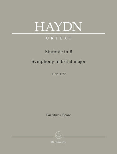 **Title**: Symphony in B-flat major Hob. I:77 | **Comments on Version**: Urtext from: Joseph Haydn Works, G. Henle Verlag Munich | **Composer / Author**: Haydn, Joseph | **Editor**: Gerlach, Sonja / Murray, Sterling E. | **Preface**: Friesenhagen, Andreas | **Edition Type**: Score, Urtext edition | **Instrumentation**: Orchestra | **Scoring/ Instrumentation**: Orchestra | **Binding**: Stapled | **Duration**: 00:21:00 | **Printing**: 1st printing 2020 | **Weight**: 225.0 g | **Format**: 31,0 x 24,3 cm | **Pages**: IV, 41 S. | **Language**: EN | Sample: https://data.baerenreiter.com/NB/BA/BA10986_00_9790006569106_nb_lrg_01.jpg