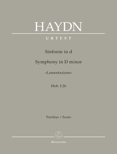 **Title**: Symphony in D minor Hob. I:26 "Lamentazione" | **Comments on Version**: Urtext from: Henle Complete Edition of the Works of Joseph Haydn | **Composer / Author**: Haydn, Joseph | **Editor**: Friesenhagen, Andreas / Heitmann, Christin | **Preface**: Friesenhagen, Andreas | **Edition Type**: Score, Urtext edition | **Instrumentation**: Chamber orchestra | **Scoring/ Instrumentation**: Oboes (2), Horns (2), Violins (2), Viola, Basso | **Binding**: Stapled | **Level of Difficulty**: 3.0 | **Duration**: 00:17:00 | **Printing**: 1st printing 2015 | **Weight**: 114.0 g | **Format**: 31,0 x 24,3 cm | **Pages**: IV, 15 S. | **Language**: EN | Sample: https://data.baerenreiter.com/NB/BA/BA10975_00_9790006558872_nb_lrg_01.jpg