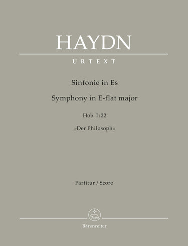 **Title**: Symphony in E-flat major Hob. I:22 "Der Philosoph" | **Comments on Version**: Urtext from the G. Henle Complete Edition of the "Works of Joseph Haydn" | **Composer / Author**: Haydn, Joseph | **Editor**: Walter, Horst | **Edition Type**: Score, Urtext edition | **Instrumentation**: Orchestra | **Binding**: Paperback | **Duration**: 00:20:00 | **Printing**: 1st printing 2023 | **Weight**: 116.0 g | **Format**: 31,0 x 24,3 cm | **Pages**: IV, 16 S. | **Language**: EN | Sample: https://data.baerenreiter.com/NB/BA/BA10991_00_9790006577453_nb_lrg_01.jpg