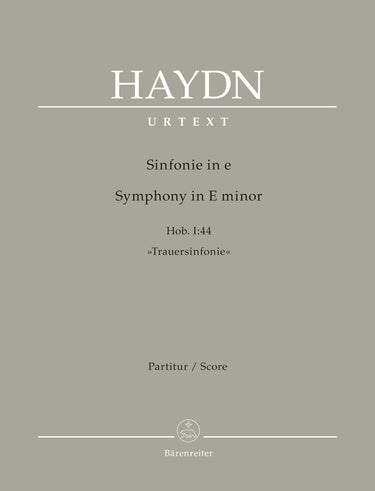 **Title**: Symphony in E minor Hob. I:44 | **Subtitle**: Trauersinfonie | **Comments on Version**: Urtext from the G. Henle Complete Edition of the "Works of Joseph Haydn" from: Joseph Haydn Werke, G. Henle Verlag München | **Composer / Author**: Haydn, Joseph | **Editor**: Friesenhagen, Andreas / Wilker, Ulrich | **Edition Type**: Score, Urtext edition | **Instrumentation**: Orchestra | **Scoring/ Instrumentation**: Oboes (2), Horns (2), Violins (2), Viola, Basso continuo | **Binding**: Paperback | **Printing**: 1st printing 2021 | **Weight**: 179.0 g | **Format**: 31,0 x 24,3 cm | **Pages**: IV, 32 S. | **Language**: EN | Sample: https://data.baerenreiter.com/NB/BA/BA10988_00_9790006574933_nb_lrg_01.jpg