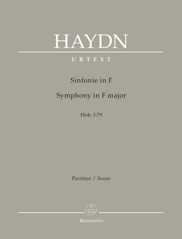 **Title**: Symphony in F major Hob. I:79 | **Comments on Version**: Urtext from the G. Henle Complete Edition of the "Works of Joseph Haydn" | **Composer / Author**: Haydn, Joseph | **Editor**: Gerlach, Sonja / Murray, Sterling E. | **Edition Type**: Score, Urtext edition | **Scoring/ Instrumentation**: Orchestra | **Binding**: Stapled | **Duration**: 00:21:00 | **Printing**: 1st printing 2019 | **Weight**: 261.0 g | **Format**: 31,0 x 24,3 cm | **Pages**: III, 51 S. | **Language**: EN | Sample: https://data.baerenreiter.com/NB/BA/BA10984_00_9790006567294_nb_lrg_01.jpg