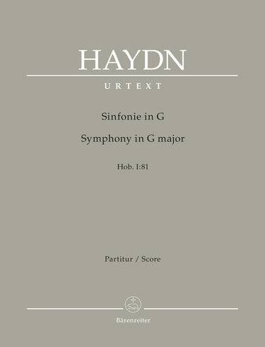 **Title**: Symphony in G major Hob. I:81 | **Comments on Version**: Urtext from the G. Henle Complete Edition of the Works of Joseph Haydn | **Composer / Author**: Haydn, Joseph | **Editor**: Gerlach, Sonja / Murray, Sterling E. | **Preface**: Raab, Armin | **Edition Type**: Score, Urtext edition | **Instrumentation**: Orchestra | **Scoring/ Instrumentation**: Orchestra | **Binding**: Stapled | **Duration**: 00:26:00 | **Printing**: 1st printing 2018 | **Weight**: 203.0 g | **Format**: 31,0 x 24,3 cm | **Pages**: IV, 38 S. | **Language**: EN | Sample: https://data.baerenreiter.com/NB/BA/BA10983_00_9790006565573_nb_lrg_01.jpg