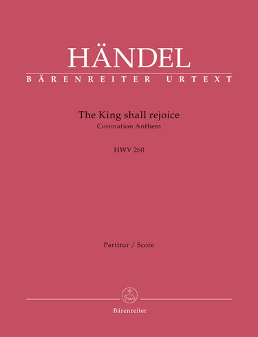 **Title**: The King shall rejoice HWV 260 | **Subtitle**: Coronation Anthem | **Composer / Author**: Handel, George Frideric | **Editor**: Blaut, Stephan | **Preface**: Blaut, Stephan | **Edition Type**: Score, Urtext edition | **Scoring/ Instrumentation**: Mixed choir (SAATBB), Orchestra | **Binding**: Stapled | **Level of Difficulty**: 3.0 | **Printing**: 3rd printing 2024 | **Language of Text Part**: English | **Weight**: 254.0 g | **Format**: 31,0 x 24,3 cm | **Pages**: IV, 50 S. | **Language**: EN | Sample: https://data.baerenreiter.com/NB/BA/BA10259_00_9790006562213_nb_lrg_01.jpg