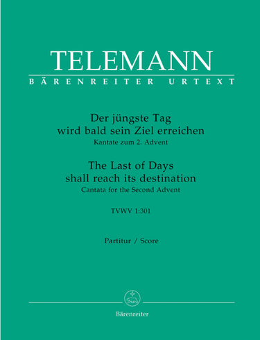 **Title**: The last of Days shall reach its destination TVWV 1:301 | **Subtitle**: Cantata for the Second Advent | **Composer / Author**: Telemann, Georg Philipp | **Editor**: Poetzsch, Ute | **Edition Type**: Score, Urtext edition | **Instrumentation**: Choir, Strings, Basso continuo | **Scoring/ Instrumentation**: Mixed choir, String orchestra | **Binding**: Stapled | **Level of Difficulty**: 3.0 | **Weight**: 130.0 g | **Format**: 31,0 x 24,2 cm | **Pages**: VII, 20 S. | **Language**: EN | Sample: https://data.baerenreiter.com/NB/BA/BA07671_00_9790006531745_nb_lrg_01.jpg
