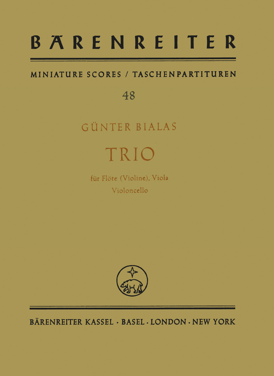 **Title**: Trio (1945) | **Composer / Author**: Bialas, Günter | **Edition Type**: Study score | **Instrumentation**: Flute, String instruments | **Binding**: Stapled | **Weight**: 20.0 g | **Format**: 18,5 x 13,5 cm | **Pages**: 16 S. | **Language**: EN | Sample: https://data.baerenreiter.com/NB/TP/TP00048_00_9790006200450_nb_lrg_01.jpg
