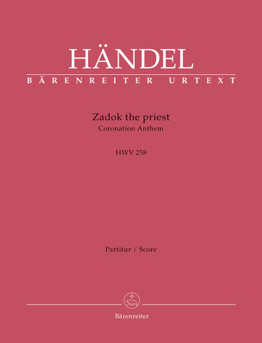 **Title**: Zadok the priest HWV 258 | **Subtitle**: Coronation Anthem | **Composer / Author**: Handel, George Frideric | **Editor**: Blaut, Stephan | **Preface**: Blaut, Stephan | **Edition Type**: Score, Urtext edition | **Scoring/ Instrumentation**: Mixed choir (SSAATBB), Orchestra | **Binding**: Stapled | **Level of Difficulty**: 3.0 | **Printing**: 3rd printing 2019 | **Language of Text Part**: English | **Weight**: 163.0 g | **Format**: 31,0 x 24,3 cm | **Pages**: IV, 27 S. | **Language**: EN | Sample: https://data.baerenreiter.com/NB/BA/BA10258_00_9790006562176_nb_lrg_01.jpg