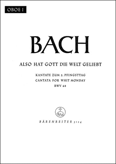**Title**: Also hat Gott die Welt geliebt BWV 68 | **Subtitle**: Cantata for Whit Monday | **Composer / Author**: Bach, Johann Sebastian | **Editor**: Dürr, Alfred | **Edition Type**: Wind set, Urtext edition | **Scoring/ Instrumentation**: Oboes (2), Horn, Trumpets (2), Cornett, Trombones (3) | **Binding**: Stapled | **Weight**: 180.0 g | **Format**: 32,5 x 25,5 cm | **Pages**: 3/3/3/7/7/7/5 S. | **Language**: EN | Sample: https://data.baerenreiter.com/NB/BA/BA10068_65_9790006490431_nb_lrg_01.jpg