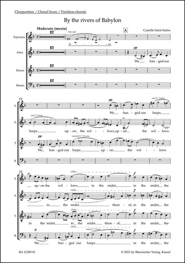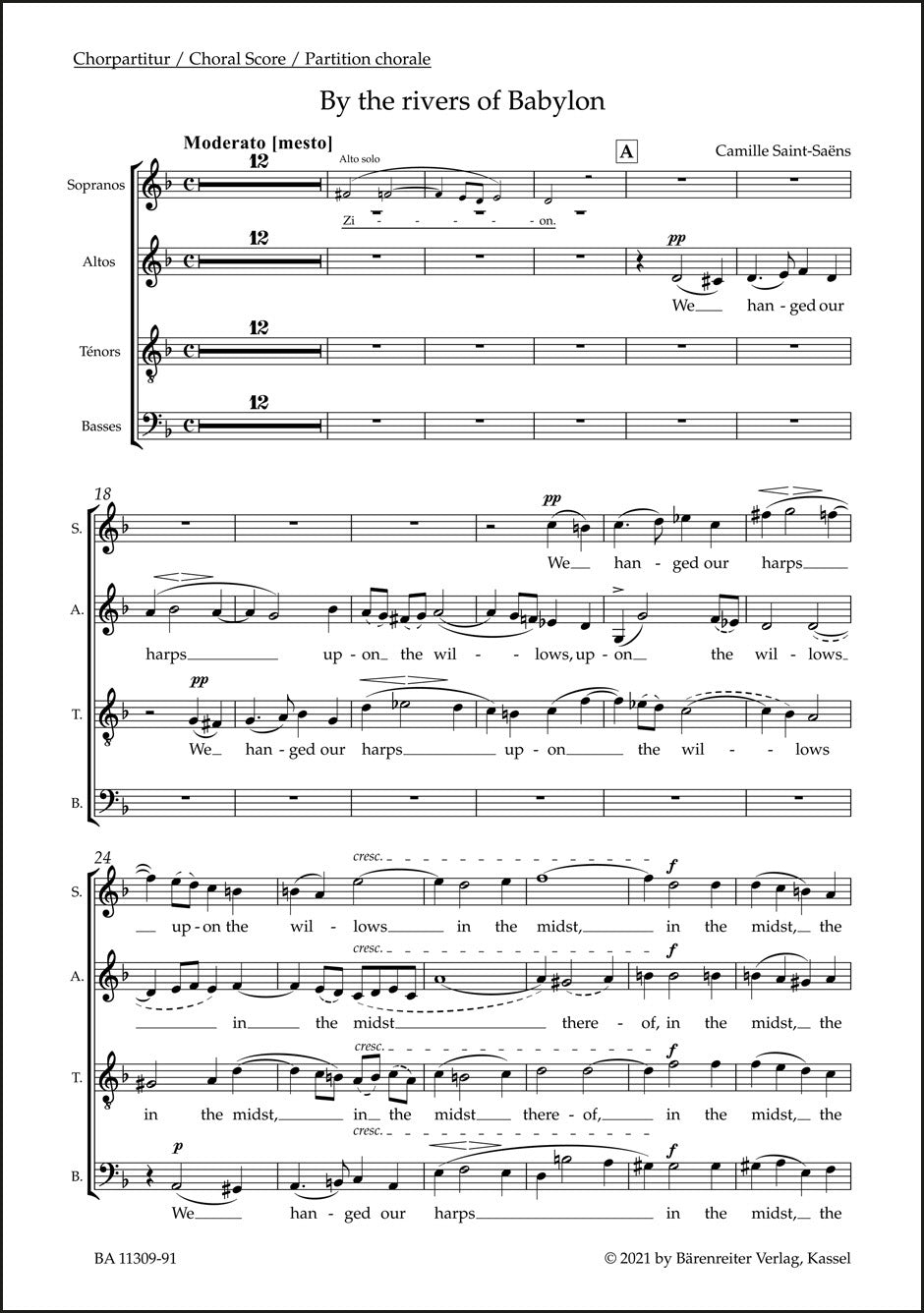 **Title**: By the rivers of Babylon | **Composer / Author**: Saint-Saëns, Camille | **Editor**: Stahl, Christina M. | **Edition Type**: Choral score | **Instrumentation**: Alto, Mixed choir (SATB), Piano | **Binding**: Paperback | **Language of Text Part**: English | **Weight**: 21.0 g | **Format**: 27,0 x 19,0 cm | **Pages**: 8 S. | **Language**: EN | Sample: https://data.baerenreiter.com/NB/BA/BA11309_91_9790006569182_nb_lrg_01.jpg
