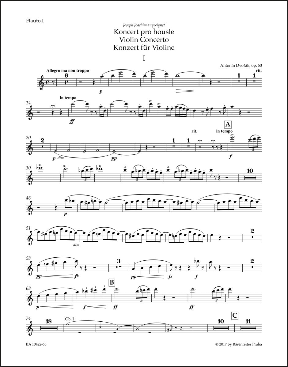 **Title**: Concerto for Violin and Orchestra in A minor op. 53 | **Composer / Author**: Dvorak, Antonin | **Editor**: Cividini, Iacopo | **Edition Type**: Wind set, Urtext edition | **Scoring/ Instrumentation**: 1. Flute, 2. Flute, 1. Oboe, 2. Oboe, 1. Clarinet, 2. Clarinet, 1. Bassoon, 2. Bassoon, 1. Horn, 2. Horn, 3. Horn, 4. Horn, 1. Trumpet, 2. Trumpet, Timpani | **Binding**: Stapled | **Weight**: 499.0 g | **Format**: 32,5 x 25,5 cm | **Pages**: 7/8/8/7/7/7/8/7/8/8/8/8/6/6/6 S. | **Language**: EN | Sample: https://data.baerenreiter.com/NB/BA/BA10422_65_9790260108110_nb_lrg_01.jpg