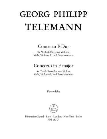 **Title**: Concerto für Altblockflöte, zwei Violinen, Viola, Violoncello und Basso continuo F-Dur TWV 51:F1 | **Composer / Author**: Telemann, Georg Philipp | **Editor**: Ruëtz, Manfred | **Edition Type**: Part | **Scoring/ Instrumentation**: Treble recorder | **Binding**: Stapled | **Weight**: 28.0 g | **Format**: 30,0 x 23,0 cm | **Pages**: 7 S. | **Language**: EN | Sample: https://data.baerenreiter.com/NB/HM/HM00130_24_9790006002665_nb_lrg_01.jpg