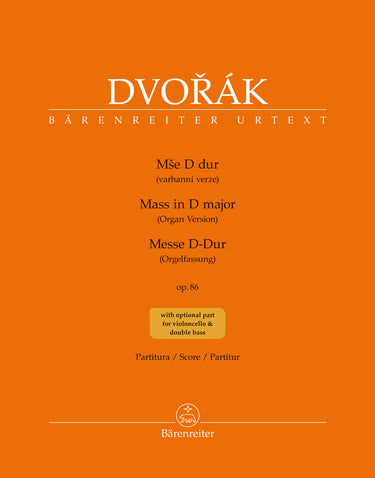 **Title**: Mass in D major op. 86 | **Misc Information**: Organ version | **Comments**: Replaces H 4952, not compatible with BA 7511, H 4952, H 4839, H 4839-72 | **Composer / Author**: Dvorak, Antonin | **Editor**: Utidjian, Haig | **Preface**: Utidjian, Haig | **Edition Type**: Score, Urtext edition | **Scoring/ Instrumentation**: Soprano solo, Alto solo, Tenor solo, Bass solo, Mixed choir (SATB), Organ, Violoncello ad libitum, Double bass ad libitum | **Binding**: Paperback | **Level of Difficulty**: 3.0 | **Printing**: 1st printing 2020 | **Language of Text Part**: Latin | **Weight**: 431.0 g | **Format**: 31,0 x 24,3 cm | **Pages**: IX, 90 S. | **Language**: EN | Sample: https://data.baerenreiter.com/NB/BA/BA10434_00_9790260108523_nb_lrg_01.jpg