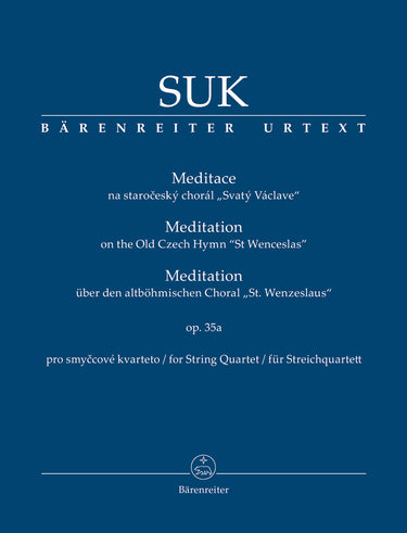 **Title**: Meditation on the Old Czech Hymn "St Wenceslas" for String Quartet op. 35a | **Composer / Author**: Suk, Josef | **Editor**: Nouza, Zdenek | **Preface**: Nouza, Zdenek | **Edition Type**: Study score, Urtext edition | **Instrumentation**: String quartet | **Binding**: Stapled | **Level of Difficulty**: 3.0 | **Printing**: 1st printing 2016 | **Weight**: 61.0 g | **Format**: 22,5 x 16,5 cm | **Pages**: XI, 6 S. | **Language**: EN | Sample: https://data.baerenreiter.com/NB/TP/TP00583_00_9790260107809_nb_lrg_01.jpg