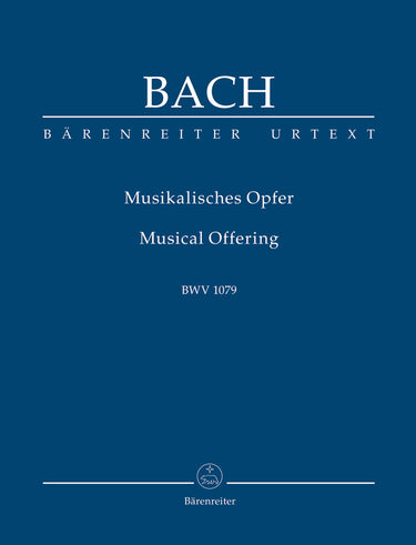 **Title**: Musical Offering BWV 1079 | **Composer / Author**: Bach, Johann Sebastian | **Editor**: Wolff, Christoph | **Preface**: Wolff, Christoph | **Edition Type**: Study score, Urtext edition | **Instrumentation**: Chamber orchestra | **Binding**: Stapled | **Level of Difficulty**: 4.0 | **Printing**: 10th printing 2022 | **Weight**: 170.0 g | **Format**: 22,5 x 16,5 cm | **Pages**: VI, 73 S. | **Language**: EN | Sample: https://data.baerenreiter.com/NB/TP/TP00198_00_9790006201679_nb_lrg_01.jpg