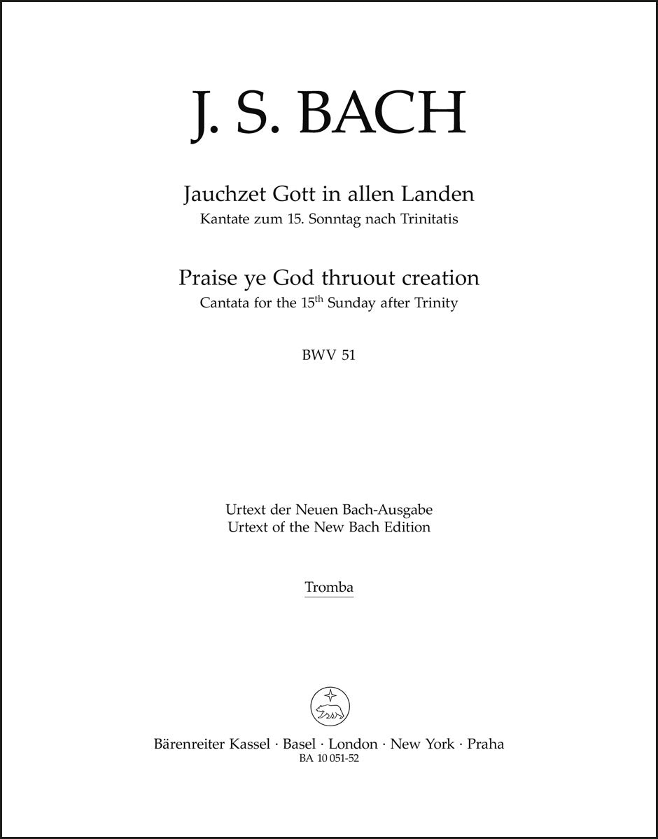 **Title**: Praise ye God thruout creation BWV 51 | **Subtitle**: Cantata for the 15th Sunday after Trinity | **Comments on Version**: Study score = TP 1051 | **Composer / Author**: Bach, Johann Sebastian | **Editor**: Wendt, Matthias | **Edition Type**: Part, Urtext edition | **Scoring/ Instrumentation**: Trumpet | **Binding**: Folded | **Weight**: 16.0 g | **Format**: 32,5 x 25,5 cm | **Pages**: 4 S. | **Language**: EN | Sample: https://data.baerenreiter.com/NB/BA/BA10051_52_9790006538003_nb_lrg_01.jpg