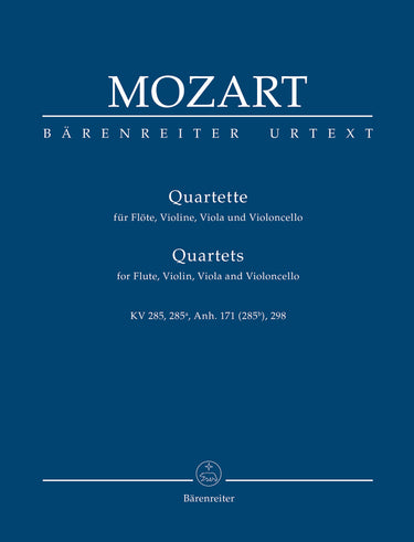 **Title**: Quartets for Flute, Violin, Viola and Violoncello | **Composer / Author**: Mozart, Wolfgang Amadeus | **Editor**: Pohanka, Jaroslav | **Preface**: Pohanka, Jaroslav | **Edition Type**: Study score, Urtext edition, Anthology | **Instrumentation**: Flute, String instruments | **Binding**: Stapled | **Level of Difficulty**: 3.0 | **Printing**: 11th printing 2018 | **Weight**: 174.0 g | **Format**: 22,5 x 16,5 cm | **Pages**: XIV, 66 S. | **Language**: EN | Sample: https://data.baerenreiter.com/NB/TP/TP00150_00_9790006201280_nb_lrg_01.jpg