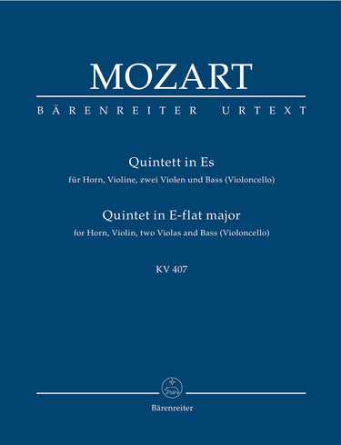 **Title**: Quintet for Horn, Violin, Two Violas and Bass (Violoncello) in E-flat major K. 407 (386c) | **Composer / Author**: Mozart, Wolfgang Amadeus | **Editor**: Schmid, Ernst Fritz | **Edition Type**: Study score, Urtext edition | **Binding**: Stapled | **Level of Difficulty**: 4.0 | **Duration**: 00:18:30 | **Printing**: 6th printing 2021 | **Weight**: 58.0 g | **Format**: 22,5 x 16,5 cm | **Pages**: 20 S. | **Language**: EN | Sample: https://data.baerenreiter.com/NB/TP/TP00013_00_9790006200115_nb_lrg_01.jpg