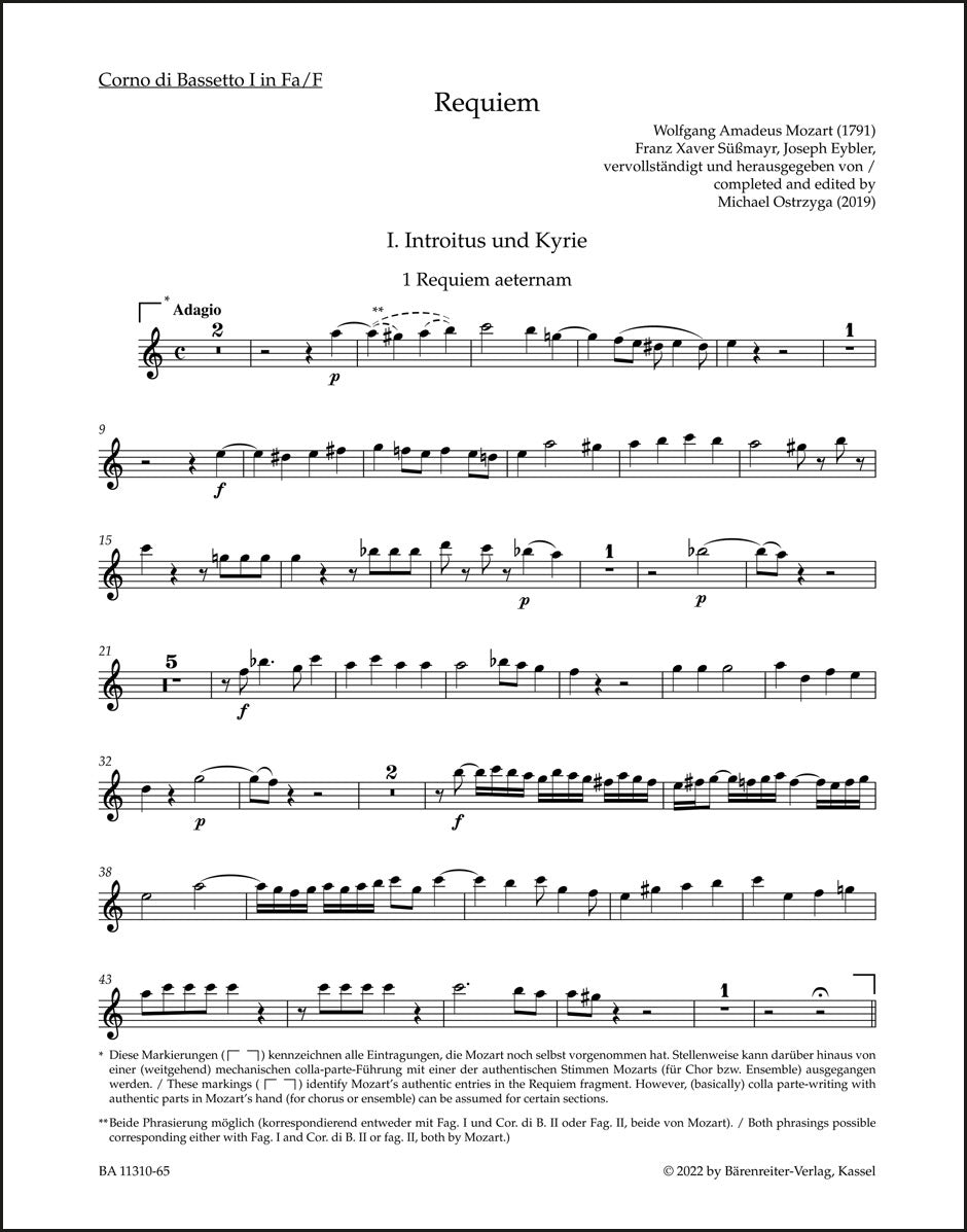 **Title**: Requiem | **Misc Information**: New Completion | **Composer / Author**: Mozart, Wolfgang Amadeus / Ostrzyga, Michael | **Editor**: Ostrzyga, Michael | **Edition Type**: Wind set, Urtext edition | **Scoring/ Instrumentation**: Basset horn (2), Bassoons (2), Clarini (2), Trombones (3), Timpani | **Binding**: Stapled | **Weight**: 557.0 g | **Format**: 32,5 x 25,5 cm | **Pages**: 13/13/15/15/6/6/6/12/13/13 S. | **Language**: EN | Sample: https://data.baerenreiter.com/NB/BA/BA11310_65_9790006569250_nb_lrg_01.jpg