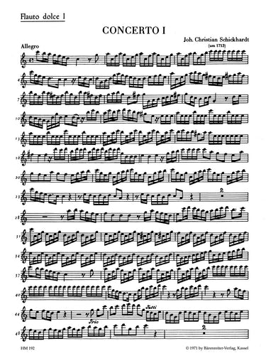 **Title**: Sechs Konzerte für 4 Altblockflöten und Basso continuo | **Subtitle**: Konzerte C-dur, d-moll und G-dur | **Misc Information**: Heft 1 | **Composer / Author**: Schickhardt, Johann Christian | **Editor**: Knab, Richard, Valentin | **Edition Type**: Part | **Scoring/ Instrumentation**: 1. Treble recorder | **Binding**: Stapled | **Weight**: 21.0 g | **Format**: 29,0 x 21,0 cm | **Pages**: 8 S. | **Language**: EN | Sample: https://data.baerenreiter.com/NB/HM/HM00192_23_9790006003808_nb_lrg_01.jpg