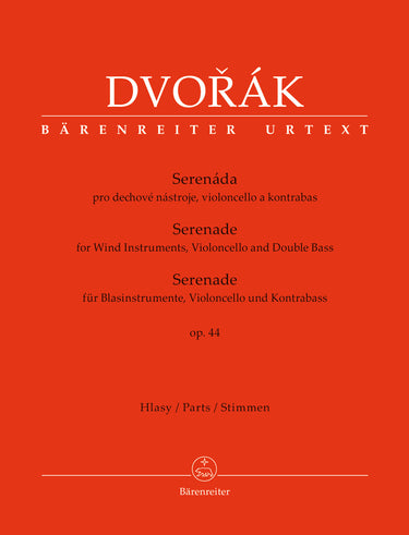 **Title**: Serenade for Wind Instruments, Violoncello and Double Bass op. 44 | **Composer / Author**: Dvorak, Antonin | **Editor**: Tait, Robin | **Edition Type**: Set of parts, Urtext edition | **Scoring/ Instrumentation**: Oboes (2), Clarinets (2), Bassoons (2), Contrabassoon ad libitum, Horns (3), Violoncello, Double bass | **Binding**: in a folder | **Level of Difficulty**: 3.0 | **Printing**: 1st printing 2016 | **Weight**: 520.0 g | **Format**: 31,0 x 24,3 cm | **Pages**: 11/8/11/8/10/11/3/11/12/8/11/10 S. | **Language**: EN | Sample: https://data.baerenreiter.com/NB/BA/BA10424_22_9790260107595_nb_lrg_01.jpg
