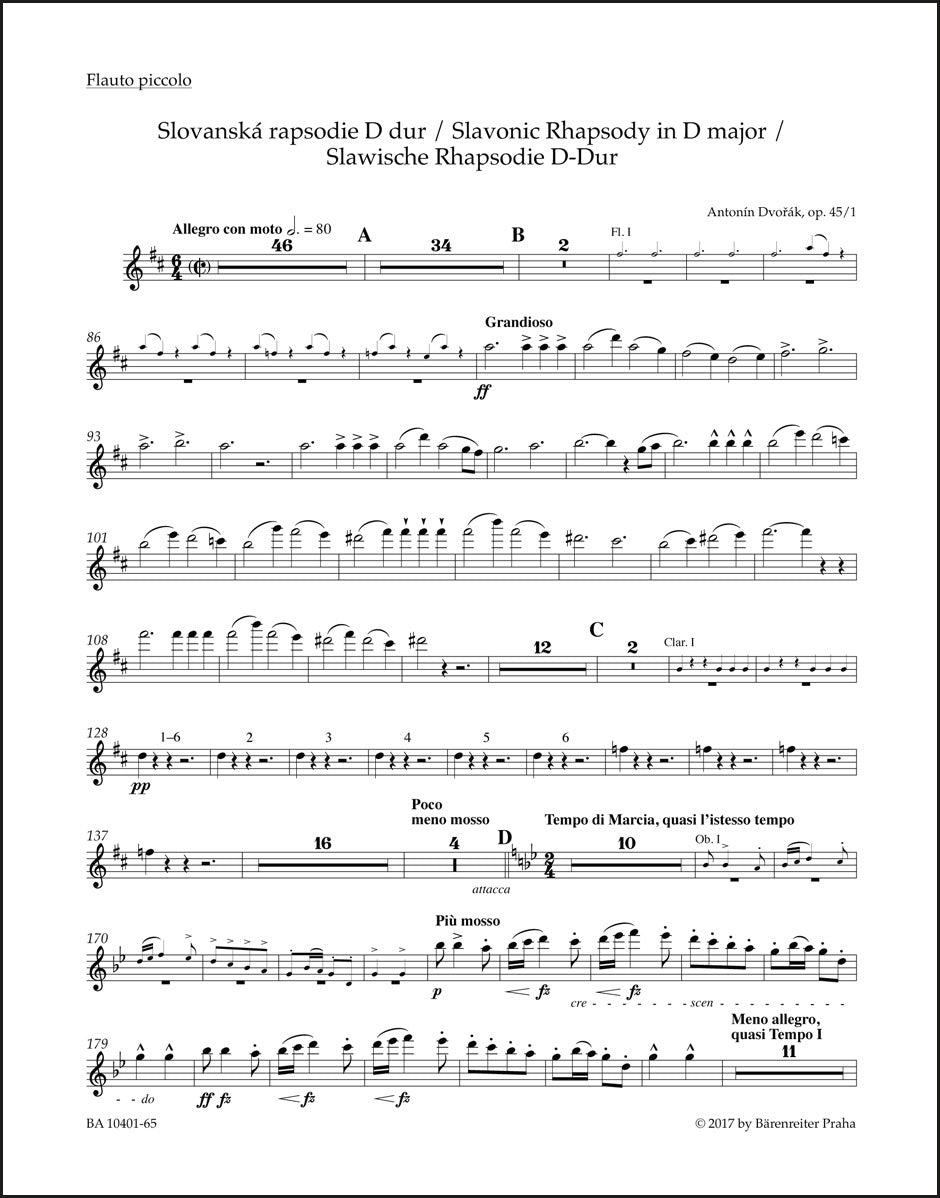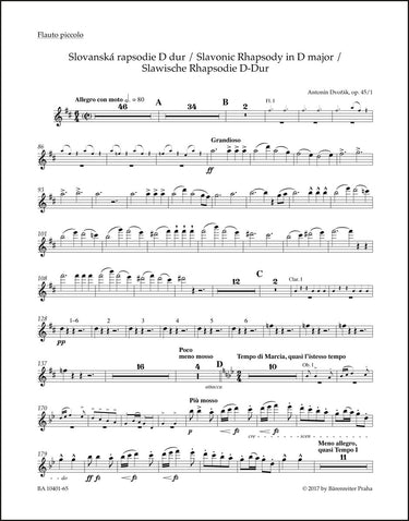 **Title**: Slavonic Rhapsody in D major op. 45/1 | **Composer / Author**: Dvorak, Antonin | **Editor**: Simon, Robert | **Edition Type**: Wind set, Urtext edition | **Scoring/ Instrumentation**: Piccolo flute, Flutes (2), Oboes (2), Clarinets (2), Bassoons (2), Horns (4), Trumpets (3), Trombones (3), Timpani, Triangle, Cymbals, Concert bass drum | **Binding**: Stapled | **Weight**: 530.0 g | **Format**: 32,5 x 25,5 cm | **Pages**: 3/8/7/7/7/7/7/7/7/7/4/5/5/3/3/3/3/3/3/3/3 S. | **Language**: EN | Sample: https://data.baerenreiter.com/NB/BA/BA10401_65_9790260108172_nb_lrg_01.jpg