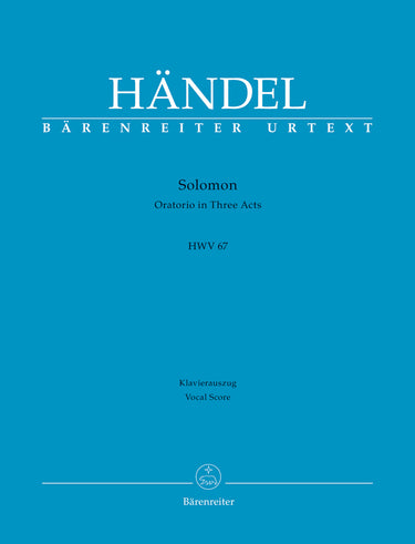**Title**: Solomon HWV 67 | **Subtitle**: Oratorio in Three Acts | **Composer / Author**: Handel, George Frideric | **Arranger**: Köhs, Andreas | **Editor**: Clausen, Hans Dieter | **Preface**: Clausen, Hans Dieter | **Edition Type**: Vocal Score, Urtext edition | **Binding**: Paperback | **Level of Difficulty**: 3.0 | **Printing**: 4th printing 2023 | **Language of Text Part**: English | **Weight**: 933.0 g | **Format**: 27,0 x 19,0 cm | **Pages**: XI, 338 S. | **Language**: EN | Sample: https://data.baerenreiter.com/NB/BA/BA10709_90_9790006544486_nb_lrg_01.jpg