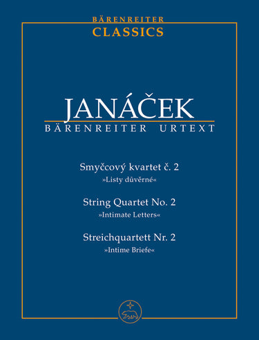 **Title**: String Quartet no. 2 "Intimate Letters" | **Comments**: Replaces H 4261 | **Composer / Author**: Janácek, Leoš | **Editor**: Faltus, Leoš / Štedron, Miloš | **Edition Type**: Study score, Urtext edition | **Instrumentation**: String quartet | **Binding**: Paperback | **Weight**: 162.0 g | **Format**: 22,5 x 16,5 cm | **Pages**: XXII, 60 S. | **Language**: EN | Sample: https://data.baerenreiter.com/NB/TP/TP00533_00_9790260104839_nb_lrg_01.jpg