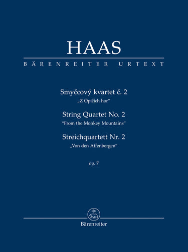 **Title**: String Quartet no. 2 op. 7 "From the Monkey Mountains" | **Misc Information**: with percussion ad libitum | **Composer / Author**: Haas, Pavel | **Editor**: Pivoda, Ondrej | **Edition Type**: Study score, Urtext edition | **Scoring/ Instrumentation**: Violins (2), Viola, Violoncello, Drums ad libitum | **Binding**: Paperback | **Level of Difficulty**: 4.0 | **Printing**: 1st printing 2020 | **Weight**: 165.0 g | **Format**: 22,5 x 16,5 cm | **Pages**: XVIII, 56 S. | **Language**: EN | Sample: https://data.baerenreiter.com/NB/TP/TP00525_00_9790260108851_nb_lrg_01.jpg