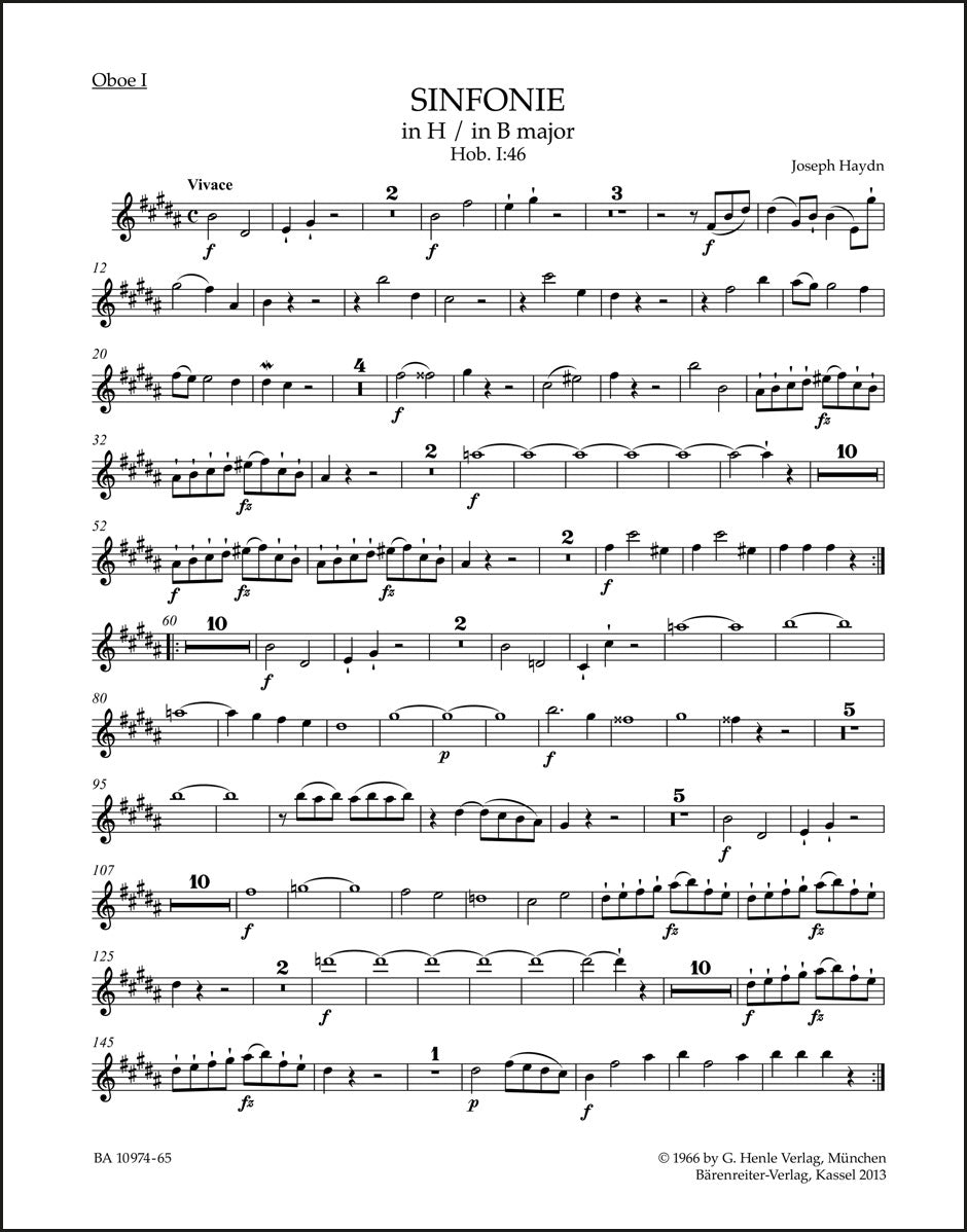 **Title**: Symphony in B major Hob. I:46 | **Comments on Version**: Urtext from: Joseph Haydn Werke, G. Henle Verlag Munich | **Composer / Author**: Haydn, Joseph | **Editor**: Mörner, Carl-Gabriel Stellan | **Edition Type**: Wind set, Urtext edition | **Scoring/ Instrumentation**: 1. Oboe, 2. Oboe, 1. Horn, 2. Horn | **Binding**: Folded | **Duration**: 00:19:00 | **Weight**: 71.0 g | **Format**: 32,5 x 25,5 cm | **Pages**: 4/4/3/3 S. | **Language**: EN | Sample: https://data.baerenreiter.com/NB/BA/BA10974_65_9790006522774_nb_lrg_01.jpg