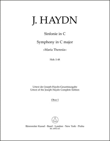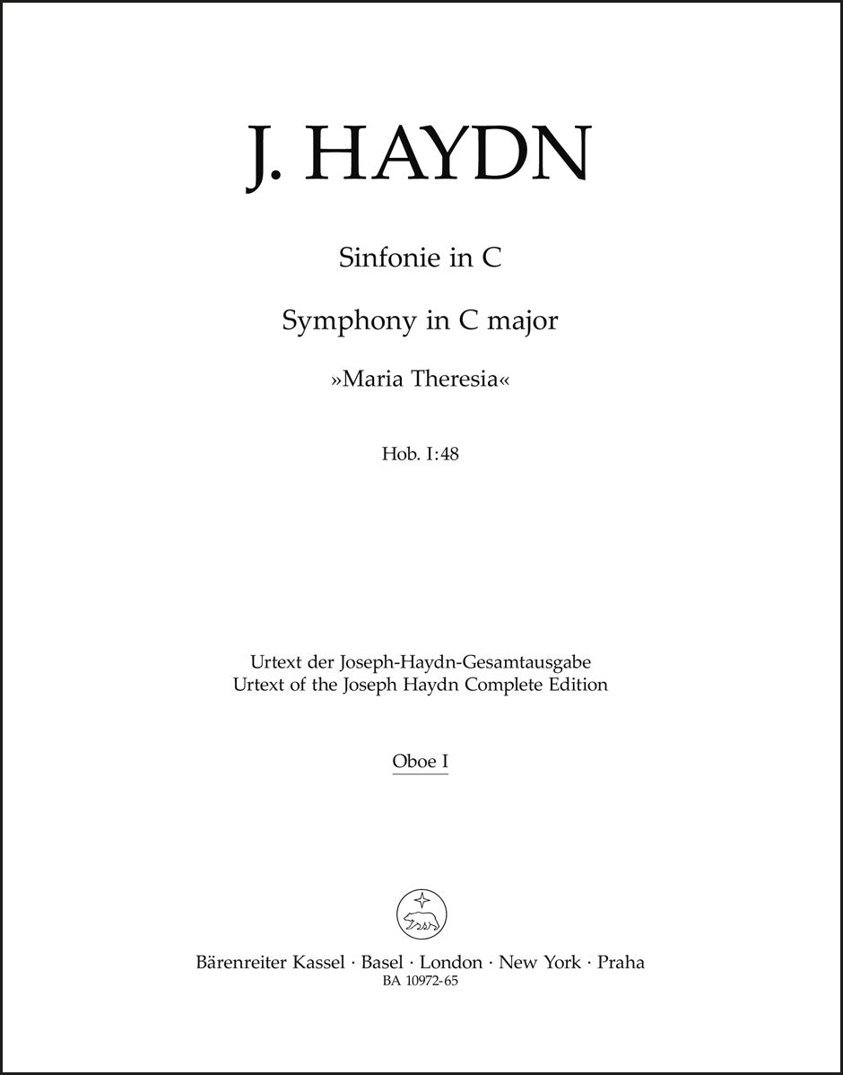 **Title**: Symphony in C major Hob. I:48 "Maria Theresia" | **Comments on Version**: Urtext from: Joseph Haydn Werke, G. Henle Verlag Munich | **Composer / Author**: Haydn, Joseph | **Editor**: Friesenhagen, Andreas / Heitmann, Christin | **Edition Type**: Wind set, Urtext edition | **Scoring/ Instrumentation**: 1. Oboe, 2. Oboe, 1. Horn, 2. Horn | **Binding**: Stapled | **Weight**: 140.0 g | **Format**: 32,5 x 25,5 cm | **Pages**: 7/7/6/6 S. | **Language**: EN | Sample: https://data.baerenreiter.com/NB/BA/BA10972_65_9790006526642_nb_lrg_01.jpg