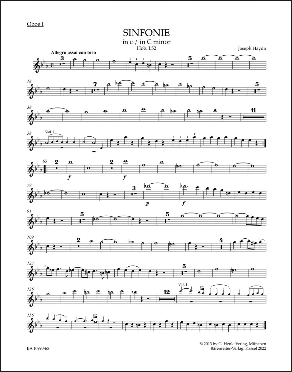 **Title**: Symphony in C minor Hob. I:52 | **Composer / Author**: Haydn, Joseph | **Editor**: Friesenhagen, Andreas / Wilker, Ulrich / Harasim, Clemens | **Edition Type**: Wind set, Urtext edition | **Scoring/ Instrumentation**: 2. Oboe, 2. Corno | **Binding**: Stapled | **Weight**: 68.0 g | **Format**: 32,5 x 25,5 cm | **Pages**: 4/4/3/3 S. | **Language**: EN | Sample: https://data.baerenreiter.com/NB/BA/BA10990_65_9790006575626_nb_lrg_01.jpg